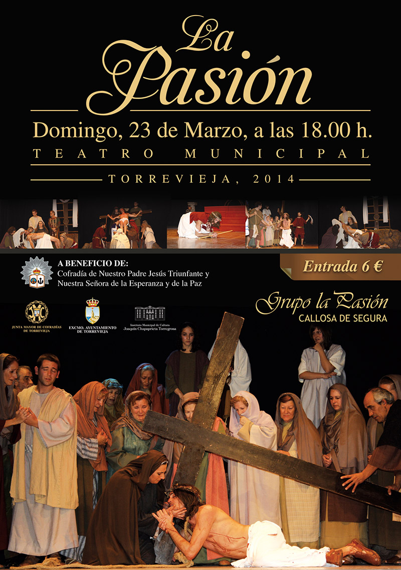 TORREVIEJA. 15-03-2014. La cofradía de Ntro. Padre Jesús Triunfante y Ntra. Sra. de la Esperanza y de la Paz, que preside Ana Isabel Ferrándiz, ha programado para el próximo domingo, 23 de marzo, a las 18.00 h en el Teatro Municipal de Torrevieja la representación de “La Pasión” que vendrá de la mano de la Asociación de Amigos “Jesús de Nazareth” de la localidad alicantina de Callosa de Segura.